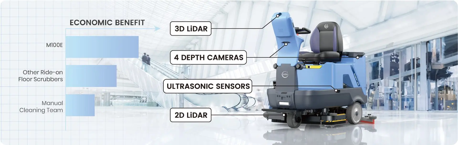 De SVEA M100E is een geavanceerde autonome vloerschrobber die uitblinkt in zowel binnen- als buitenschoonmaak. Met intelligente navigatie en obstakeldetectie, 3D LiDAR-technologie, en een combinatie van dieptecamera's en ultrasone sensoren, biedt de M100E ongeëvenaarde precisie en efficiëntie. Hij onthoudt schoonmaakroutes, past de reinigingskracht aan verschillende vloertypes aan, en kan tot 12.000 m² reinigen met één waterreservoir. Hij is ontworpen voor grote en veeleisende omgevingen zoals winkelcentra en fabrieken.
