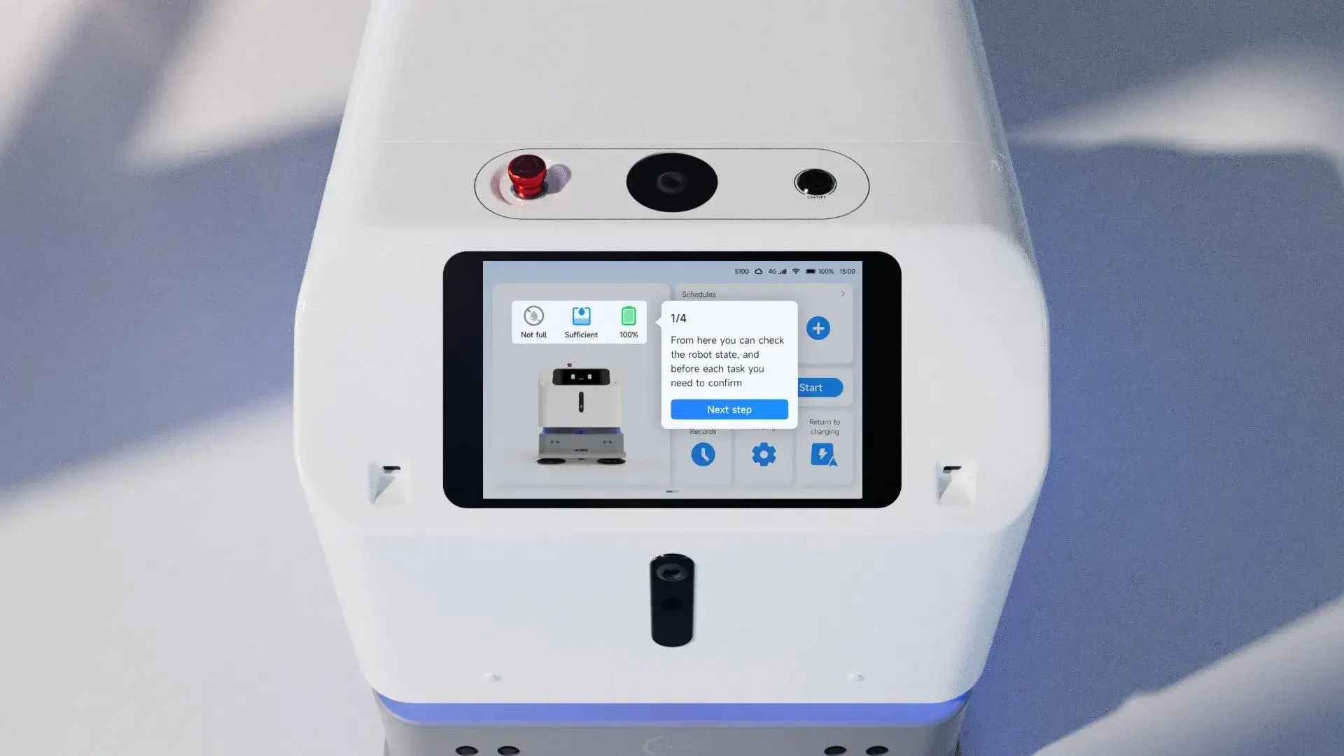 Start het schoonmaken in een paar stappen. De S100 maakt zelf een plattegrond van de ruimte, per ruimte is in te stellen hoe en wanneer er schoongemaakt moeten worden. Vegen, stofzuigen, desinfecteren, schrobben of dweilen.