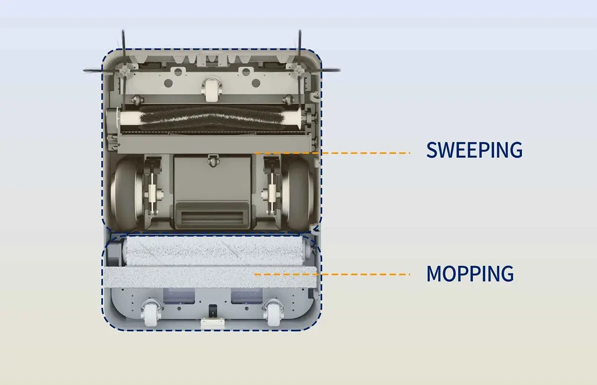 De veegunit aan de voorkant en de dweilunit aan de achterkant scheiden de droge en natte reiniging. Dit is ook onafhankelijk te gebruiken.